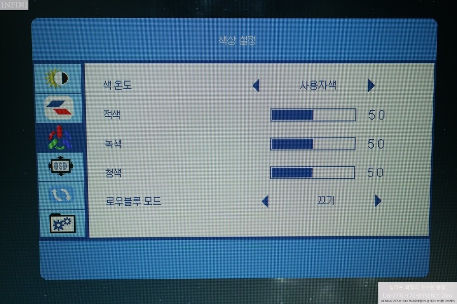 색온도, 적색, 녹색, 청색, 로우블루 모드를 설정 가능합니다.