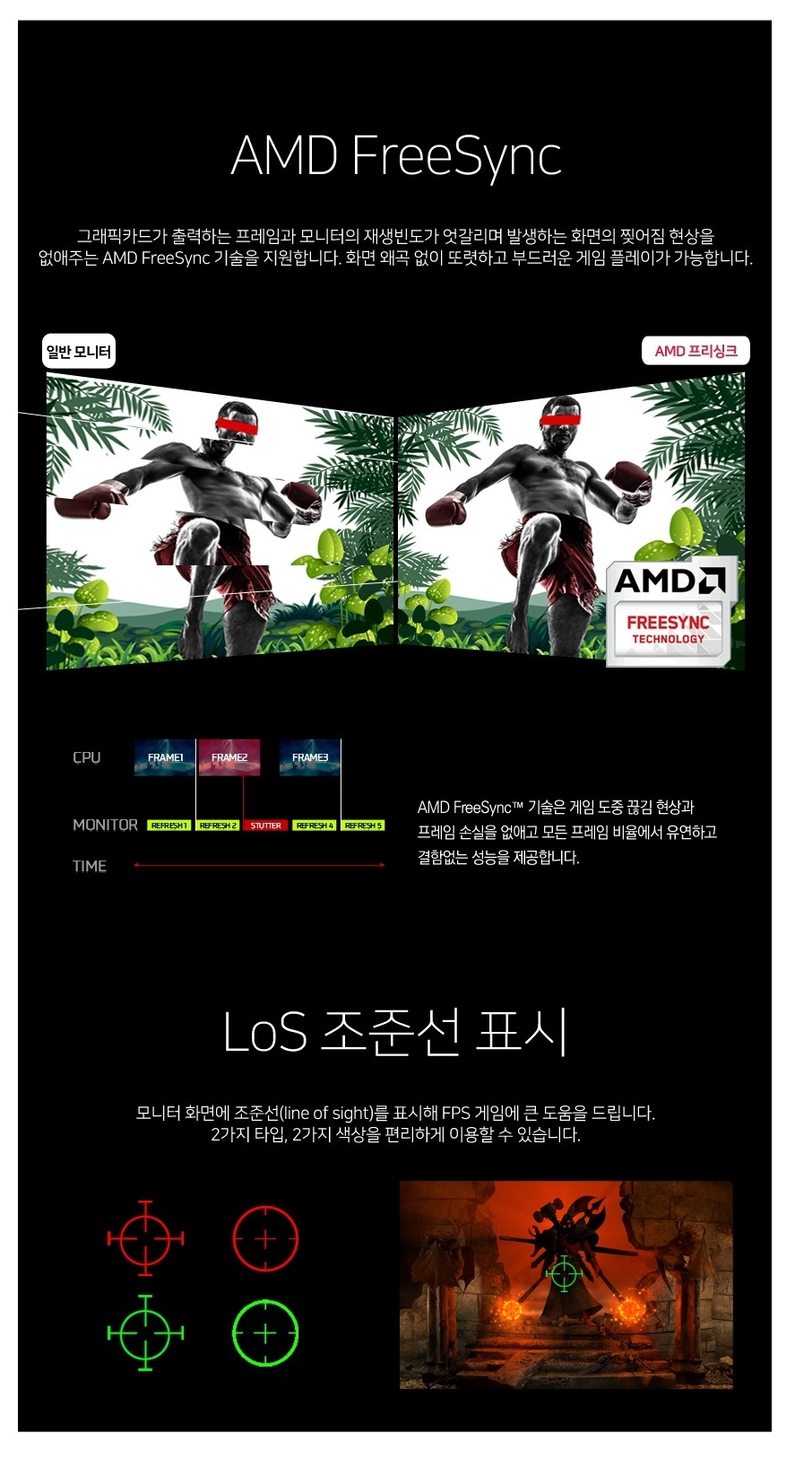 특징으로는 RTS, FPS로 색감모드를 넣었다던지 조준선 모드를 지원하며 프리싱크 기능까지 들어가 있습니다.