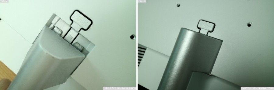 ▲ 유지코리아 INFINI UG-277K 모니터의 스탠드를 본체에 끼우기만 하면 모니터의 조립이 끝이 납니다.